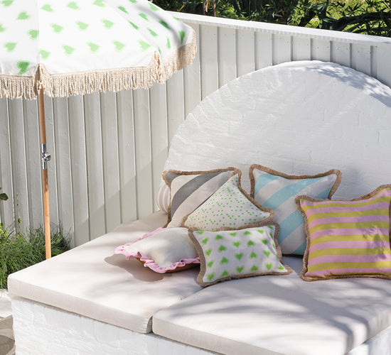 Our outdoor cushions have a water repellant coating. Please note however, the fabric is not waterproof. To ensure the quality is maintained, we advise that you bring undercover or indoors after use. Spot clean by brushing off loose dirt and using a soft sponge with mild detergent and lukewarm water. The fabric is a natural fibre and imperfections are part of its character. Minor shedding of the jute trim is to be expected.
